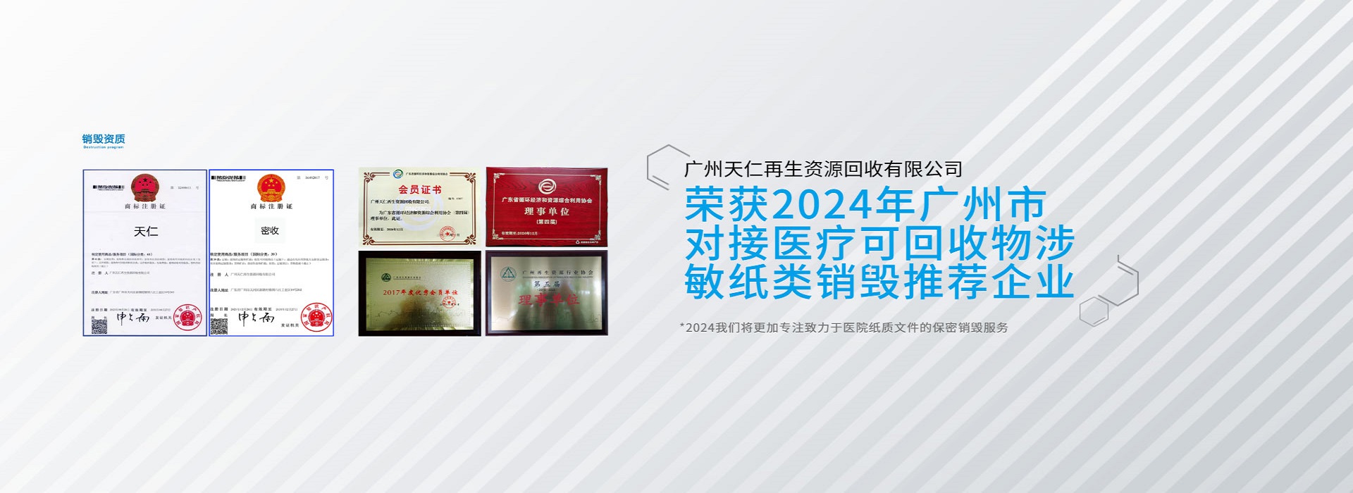 擁有"密銷" "密收"品牌商標;2017年公司被評估為廣州市再生資源行業優秀會員單位; 2018年被推選為廣州市再生資源行業協會理事單位;